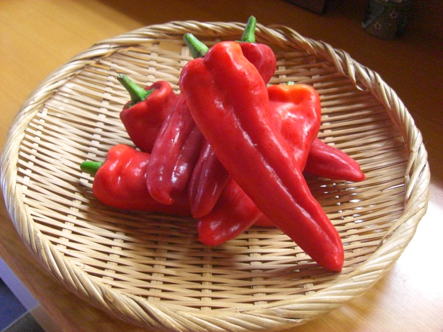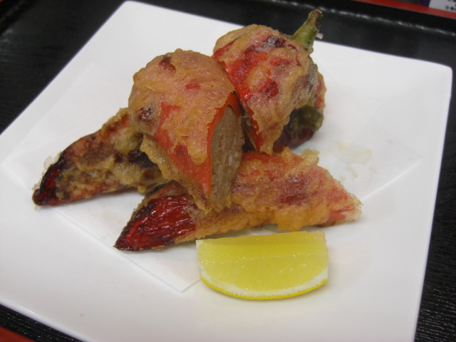 ☆万願寺とうがらし☆ メニュー 2011年10月01日 0 大阪では、よく目にする『万願寺とうがらし』。 “とうがらし”と言っても、辛味はなく、みずみずしくて、美味しいですよね~♪ 実は、故郷・山口にいるときは、見たことがないんですよ ^^; 調べてみると、その名のとおり、京都の舞鶴は万願寺地方が特産地の京野菜。 どおりで、関西ではよくお目にかかるはずですねっ☆ 初めて見たときから思ってたのですが、とにかく名前がかっこいいですね~!! 先日、あまり見かけない、色鮮やかな“赤万願寺とうがらし”を仕入れました♪ 見た目は強烈な赤ですが、辛味はまったくなく、 緑に比べて甘みがあり、青臭さもないので、とても食べやすいです( ^ー゜)b 甘~くなるまで、玉ねぎをじっくり炒めて、牛ひき肉と混ぜ合わせ、 いわゆる“ハンバーグ”のもととなるタネを作り、 これを赤万願寺とうがらしに詰め、 カリカリ・サクサクの天婦羅にしました♪ 赤万願寺とうがらし 肉詰め天婦羅 780円 ちなみに、こちらはその日のオススメということで、通常メニューではございませんので ある時・無い時がございます ^^; お肉・お魚ももちろん大好物なのですが、 三十路をまわってからなのか(汗)、この頃やけに美味しい野菜に興味が出てきました。 地元とれとれの朝採り野菜や、その地域ならではの特産野菜など、 おいしい野菜を食べると、それだけでなんか幸せ~な気分になります +.(o´∀`o)゚+.゚ 『食欲の秋』は、まだまだ終わりそうもありません・・・ ( ^―^;)